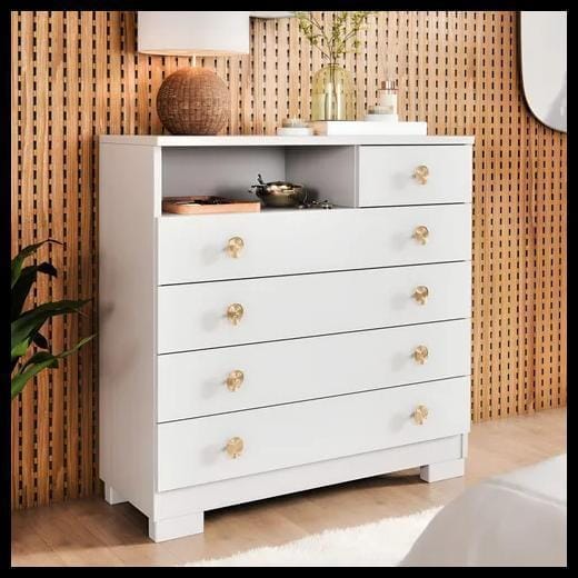 Cômoda 5 Gavetas com Nicho Organizador SELECT para Quarto 75cm Branca | Gaveteiro Multiuso com Puxadores Dourados Cor Branco