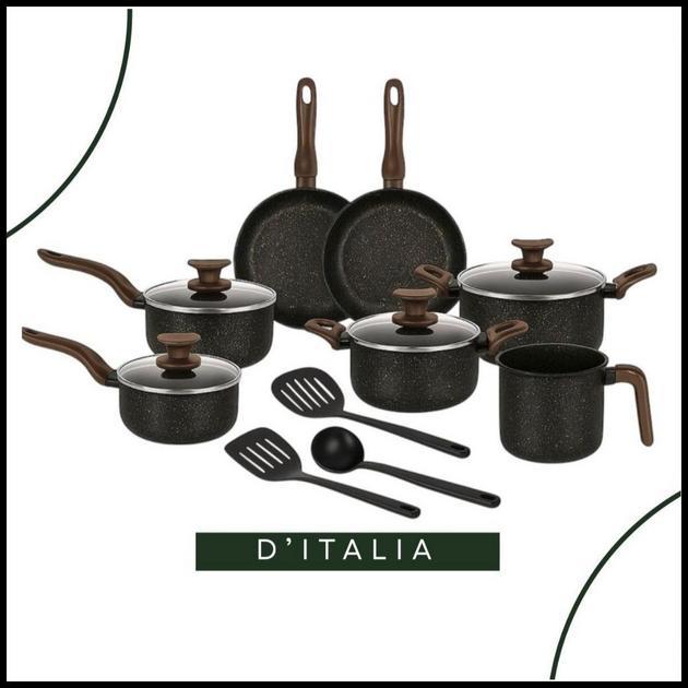 Jogo de Panelas Antiaderente 10 Peças Bianco D’Itália Cabo Marrom – Tampa de Vidro e Utensílios