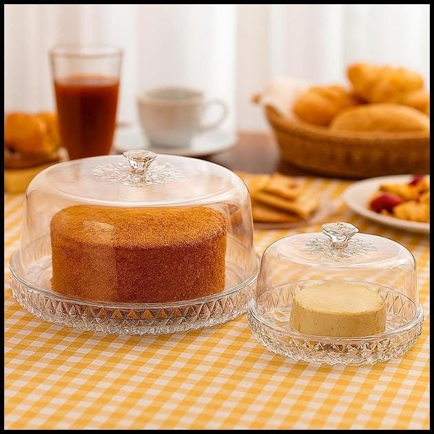 Design transparente e acabamento polido valorizam a decoração da mesa. O conjunto permite exibir bolos, queijos e doces com apresentação sofisticada, ideal para encontros, festas e dias de uso cotidiano.
