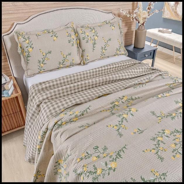 Conjunto com 3 peças: 1 colcha/bouti King e 2 porta-travesseiros com aba americana, pensados para caimento perfeito e acabamento profissional.