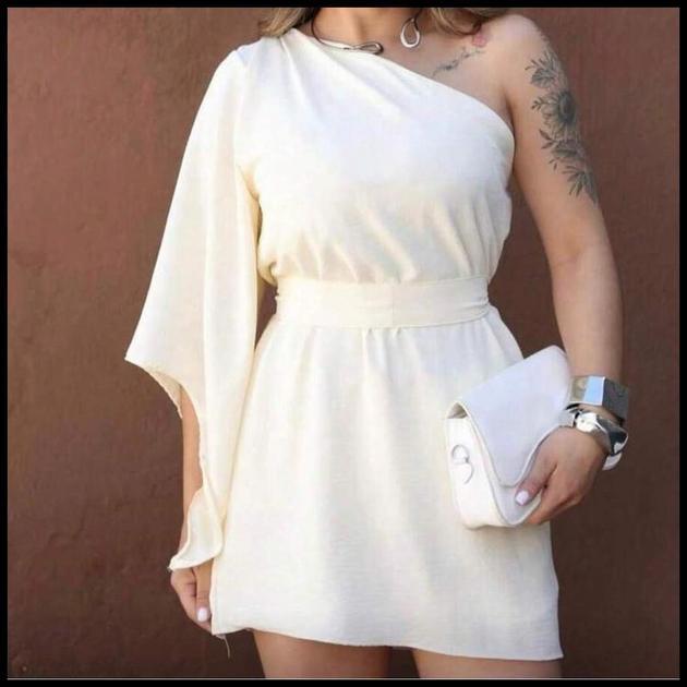 Perfeito para diferentes tipos de corpo: a amarração na cintura possibilita ajuste conforme a proporção corporal, enquanto o ombro único equilibra a silhueta com elegância.