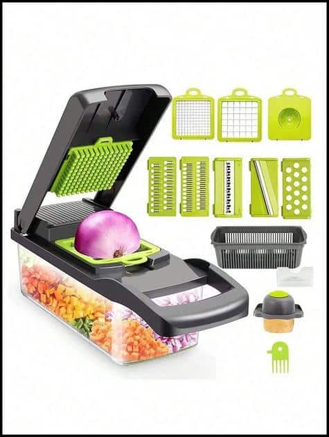 O MATOUGUI Cozinha multifuncional de aço inoxidável cortador de legumes descascador fatiador com lâmina e caixa de armazenamento de protetor de mão reúne praticidade e segurança em um único produto pensado para a rotina da cozinha.