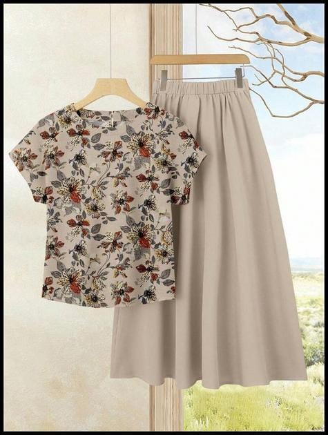 Rusticease Conjunto Elegante de Estilo Vintage com 2 Peças: Blusa Estampada + Saia Midi de Cor Sólida, Conjunto Casual de Férias para Mulheres, Conjunto de Saia de Verão, Conjunto de Blusa e Saia, Conjunto de Saia e Blusa para Mulheres, Conjunto Estampado — Visão Geral