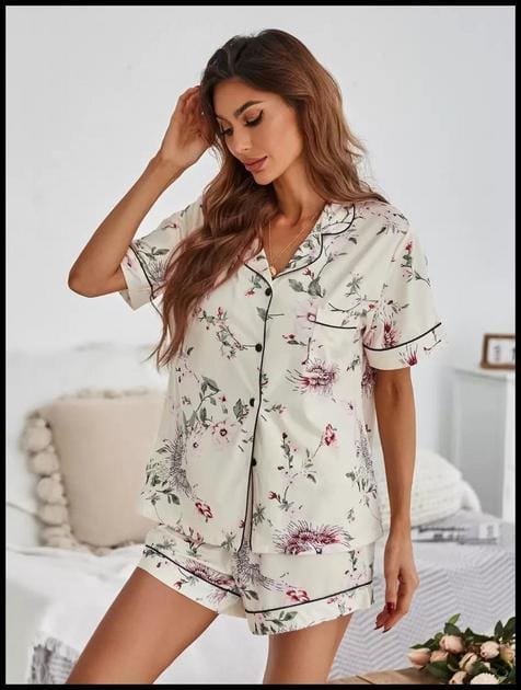Serenescape Conjunto de Pijama com Estampa Floral, Bolso Remendado e Piping Contrastante, Temporada de Férias — Visão Geral