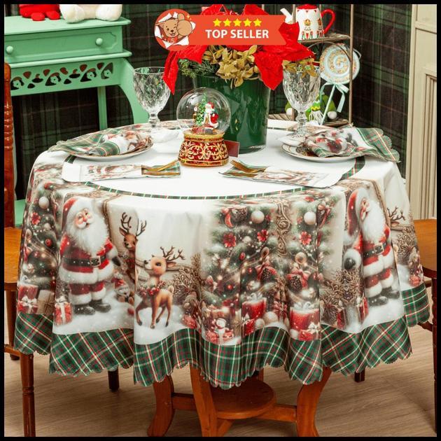 Toalha de Natal Mesa Redonda/ 4 Lugares 1,40 X 1,40 Enfeites de Natal ,Decoração Natalina Cozinha é uma solução completa para quem quer decorar com charme e eficiência. Combina qualidade, praticidade e durabilidade em uma única peça, deixando a mesa pronta para receber sem esforço.